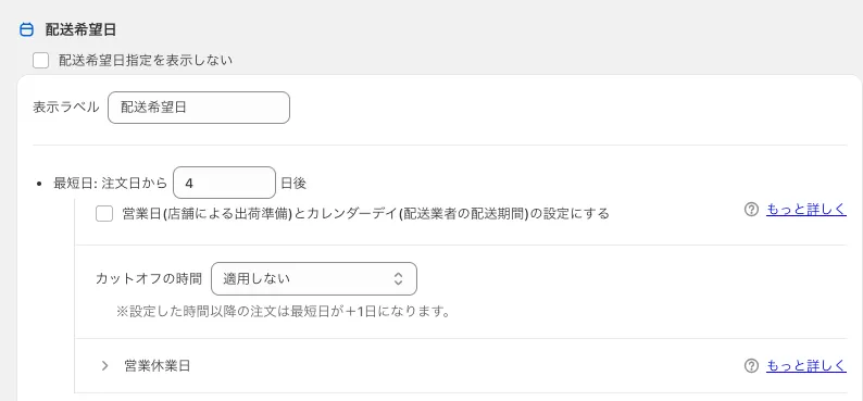 発送準備などの店舗が発送に必要な期間を設定します。営業休業日で設定した日付をもとに最短日を計算します。 -