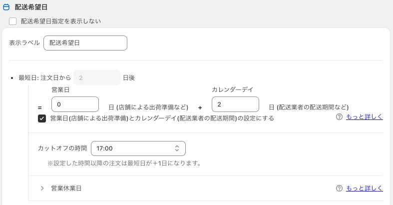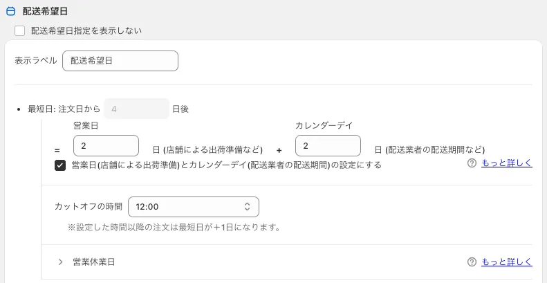配送業者などの配送期間を設定します。店舗の営業休業日に関係なく最短日を計算します。