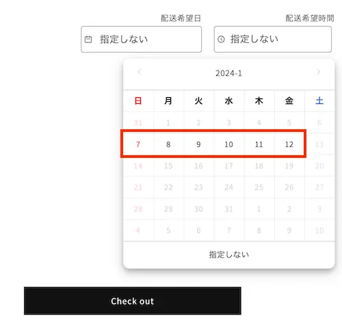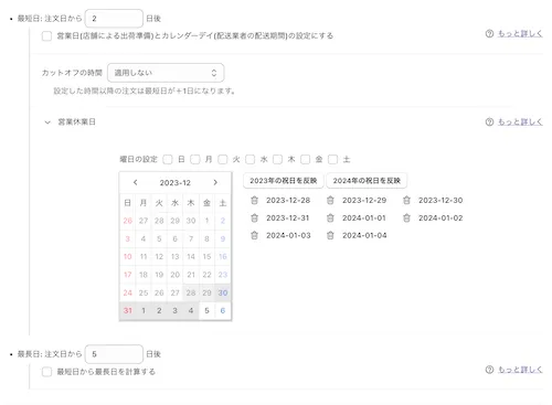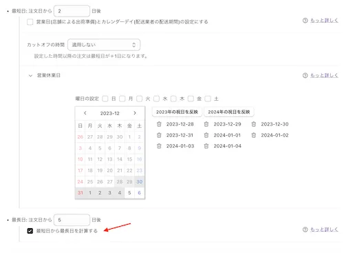 しかし、年末年始の休暇などで12/28-1/4を営業休業日としていた場合は、最長日が最短日よりも短くなり、選択できる配送日がない状態となります。
