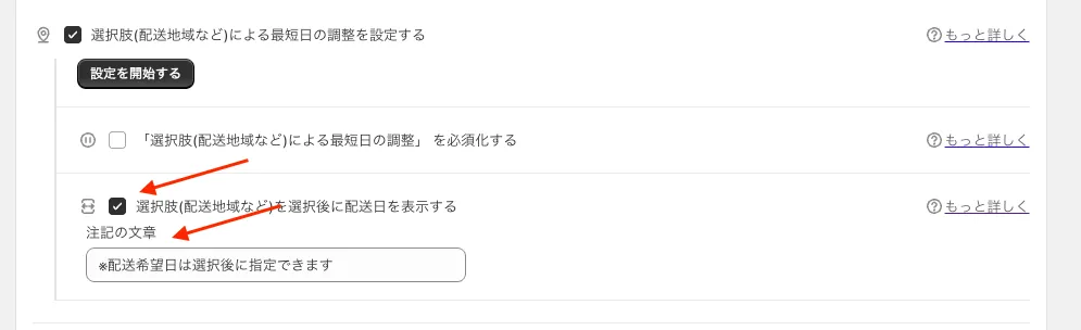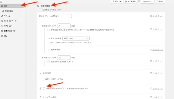 配送地域などの選択肢により、配送の最短日を設定することができます。
