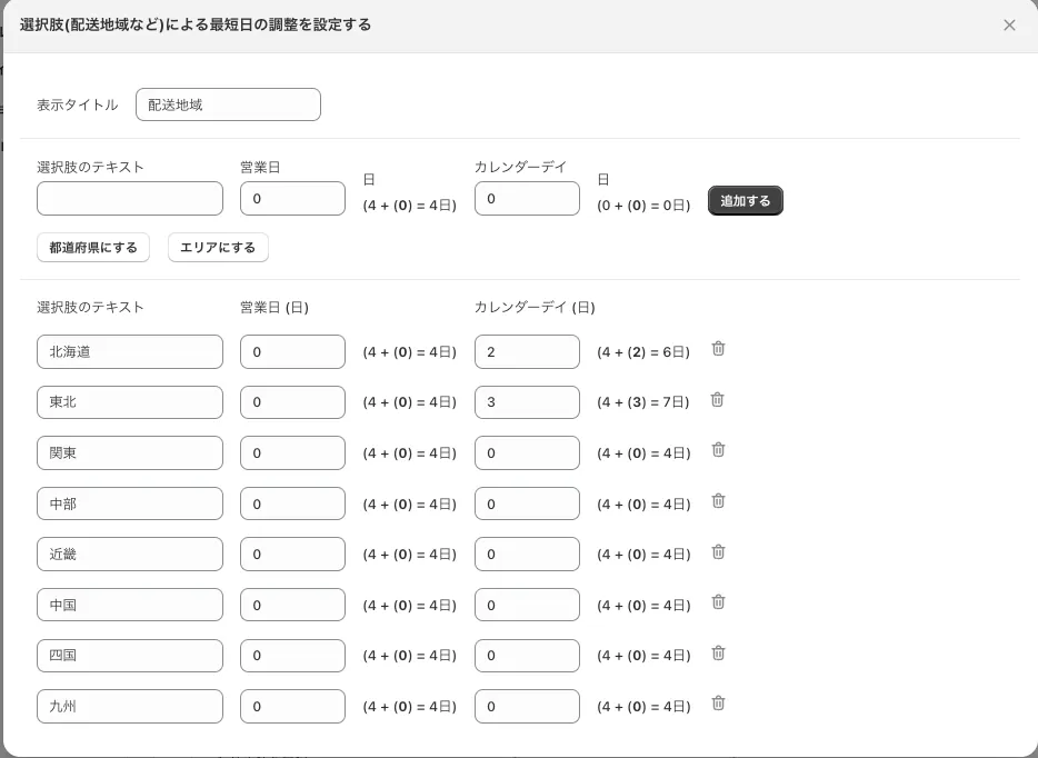 選択肢(配送地域など)による最短日の調整