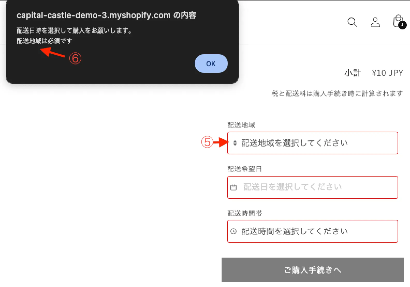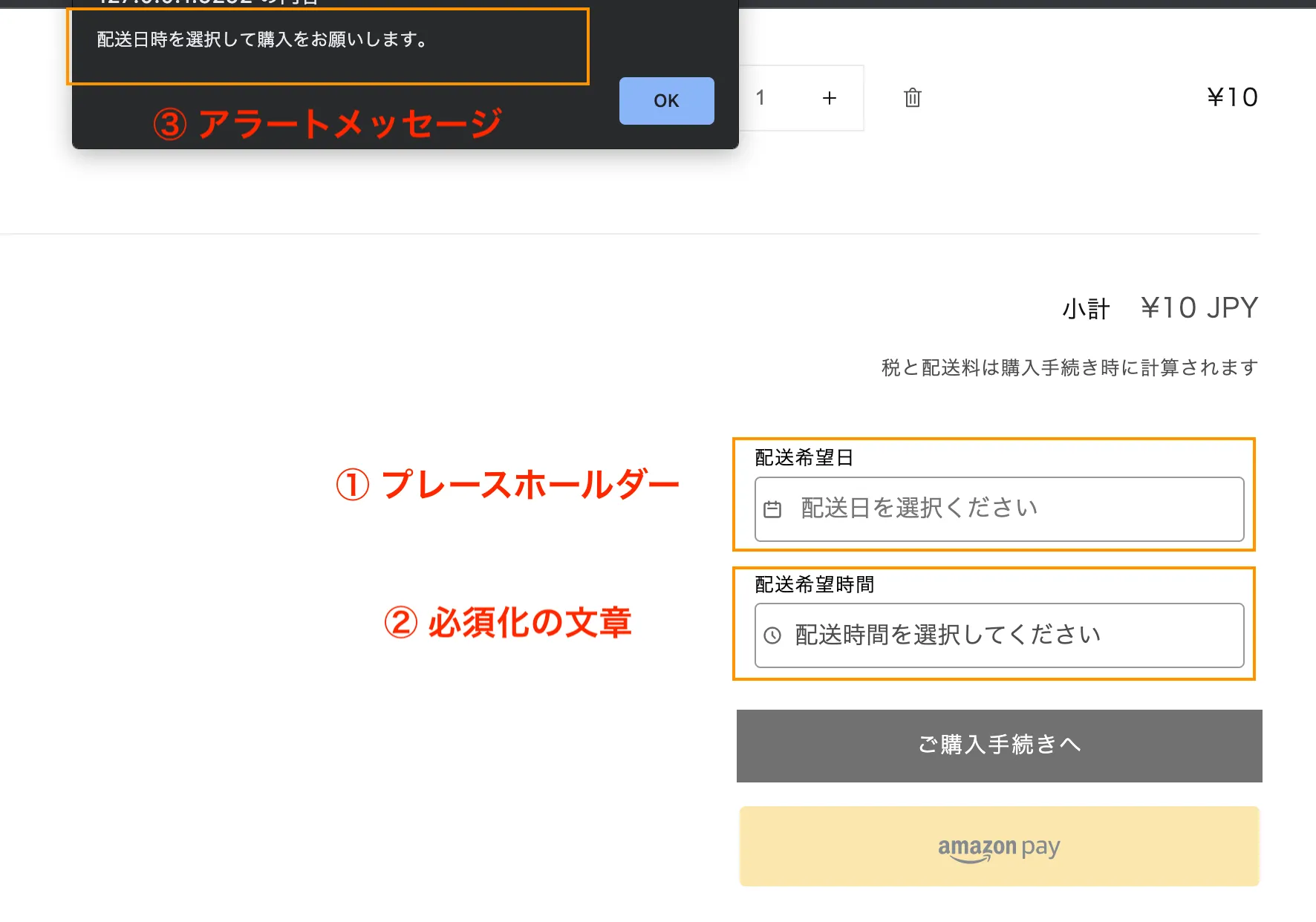 ⇒ 配送時間が入力されずに購入ボタンを押した時のメッセージです。 (配送日と共通の設定です。) - ③ 必須化の文章