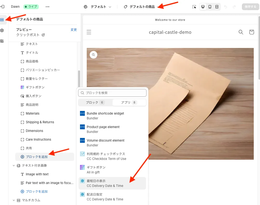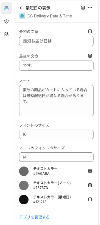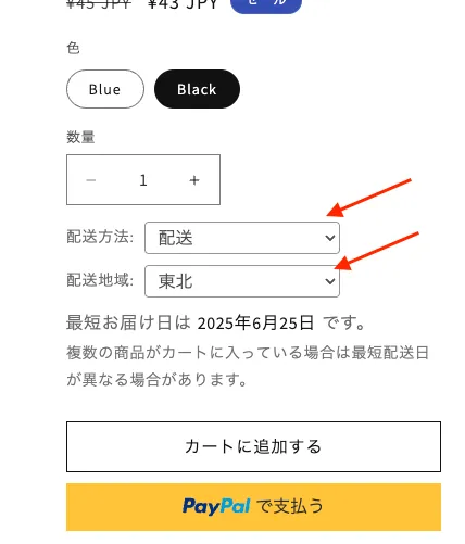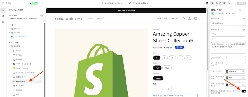 オンラインストア => カスタマイズ => 商品ページ => 最短日の表示(セクションアプリ)