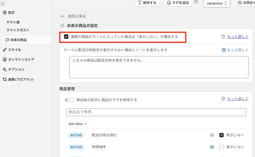 複数の商品がカートに入っていた場合、商品毎の配送日時指定の非表示 で ”表示しない” の選択をした商品が含まれていた時、非表示を優先します。