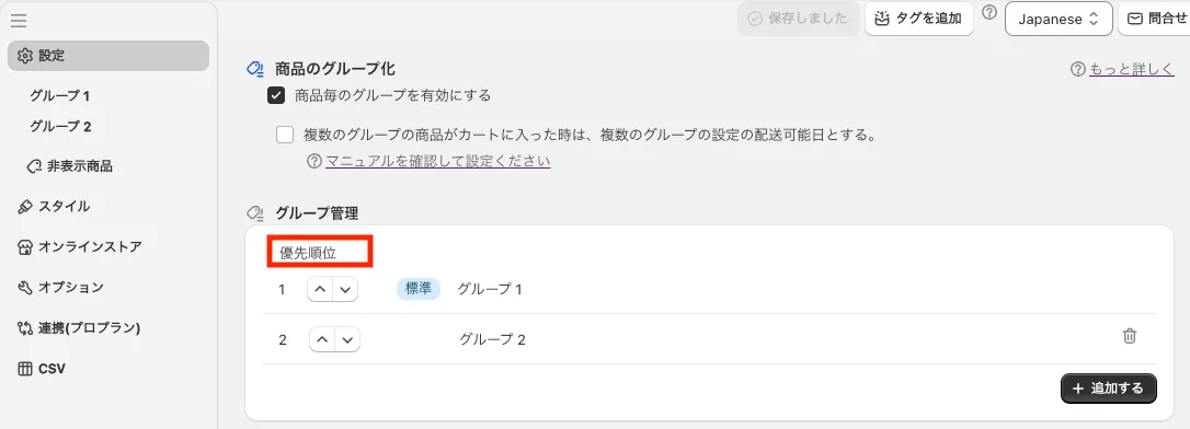複数の商品がカートにある場合、優先するグループの順番です。 (例えば、グループ1は配送最短日を6日、グループ2は配送最短日を10日の時、長い配送最短日を優先したい場合は、グループ2を優先順位1とします。)