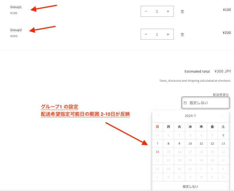 商品Group1と商品Group2がカートに入った時は、グループ1 (高い優先順位)の配送日時指定の設定が反映されます。