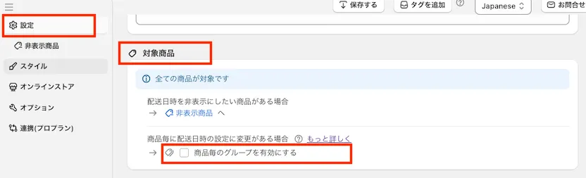 商品毎にグループを作成して、グループ毎に配送日時を設定することができます。