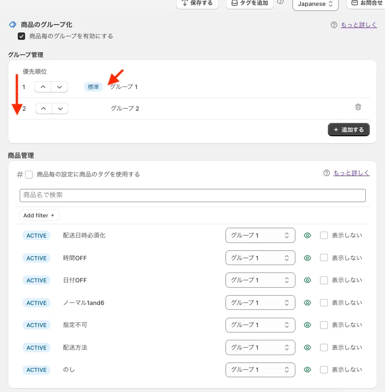 “グループ管理” からグループを作成して “商品管理” から、商品と作成したグループの紐付けを行います。(商品数が多い場合は商品のタグでの設定の検討をお願いします。)