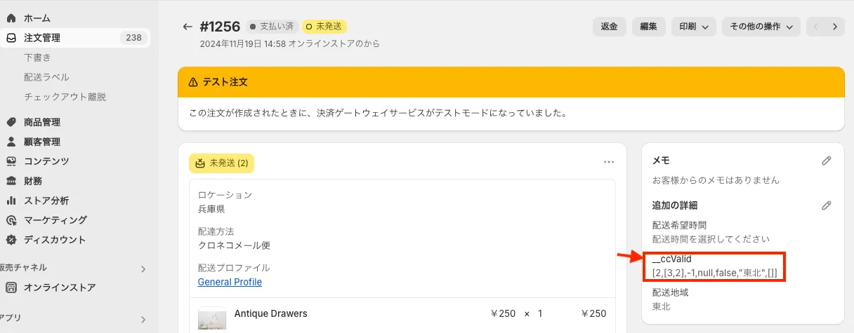 CC 配送日時指定 の設定画面 (設定サイズが大きすぎる場合はアラートが出ます) - “__ccValid” という有効性検証のためのプロパティが ”注文の詳細” に含まれます。