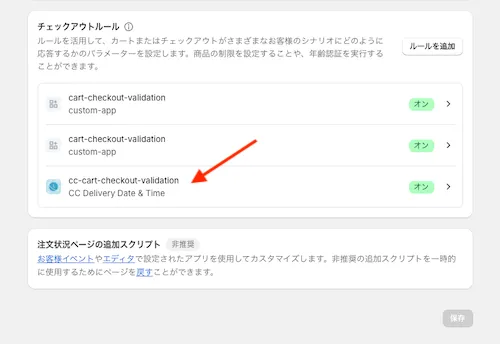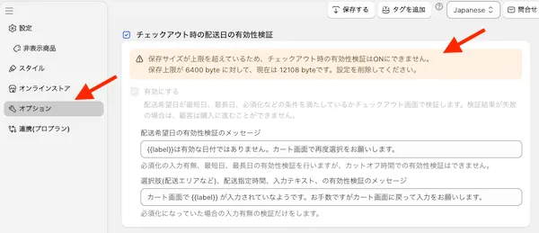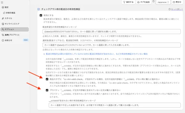 CC 配送日時指定 の設定画面 (設定サイズが大きすぎる場合はアラートが出ます) - “__ccValid” という有効性検証のためのプロパティが ”注文の詳細” に含まれます。
