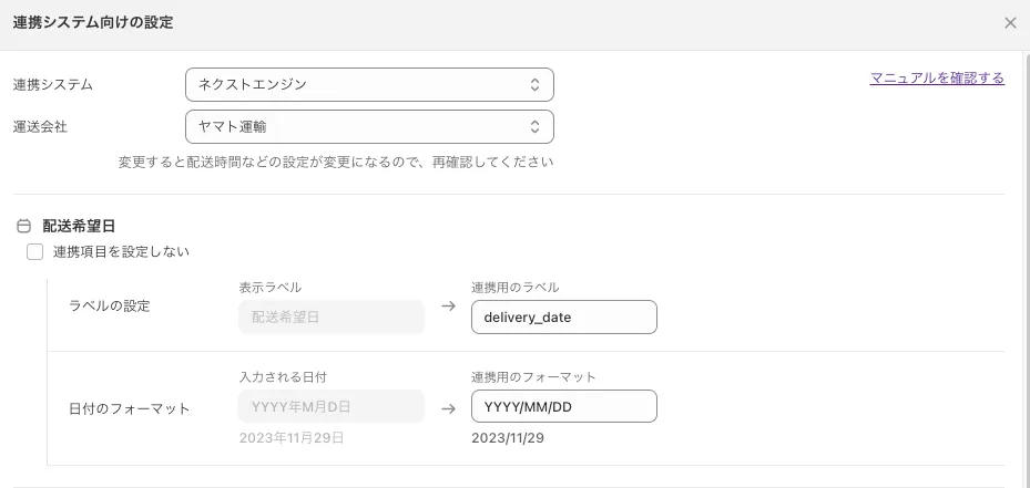 ネクストエンジン側の設定を行う。 以下のリンクからネクストエンジンのマニュアル (配送日時取り込みの設定確認 / 変更 | ECサイトの在庫,受注,発注管理 | ネットショップ管理ならネクストエンジン ) を確認して設定します。