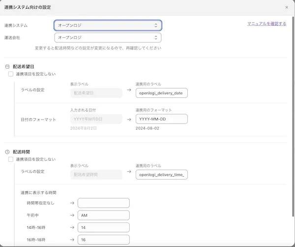- 配送時間のラベル: “openlogi_delivery_time_slot”, 規定フォーマット