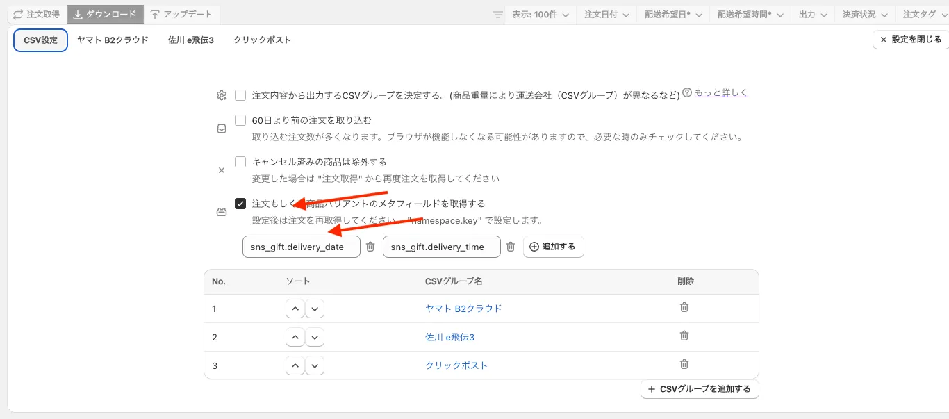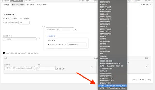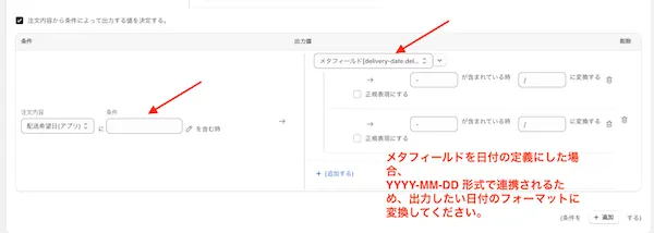 配送希望日が空白の時にメタフィールドを参照する設定にします。 (メタフィールドの値もない時は出力もブランクになります。)