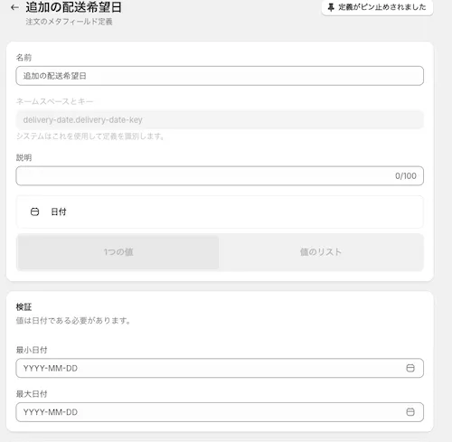 配送希望日のメタフィールドを作成