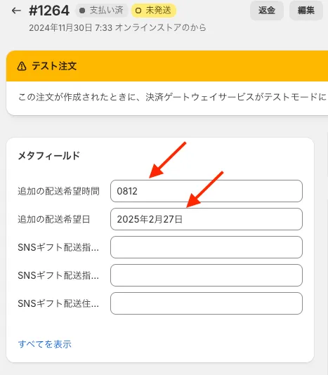 マニュアルで注文を作成した時や、配送希望日時を表示にする設定をしていた場合、注文の”追加の詳細” に配送希望日のプロパティが存在しません。 そういったケースで、注文(作成)後、お客様から配送希望日の依頼があった場合は、メタフィールドを使用するのがおすすめです。
