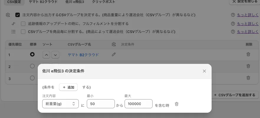 CSV設定の決定条件(注文内容で条件を設定)
