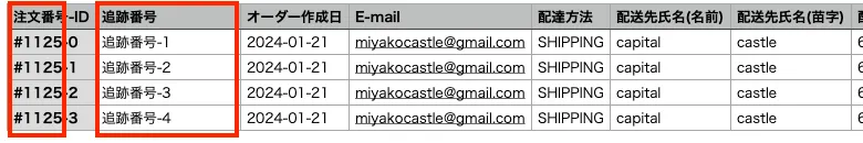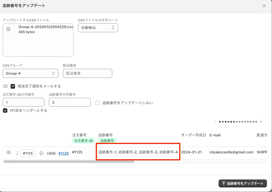 csvファイル (#1125の注文に対して”,“区切りで追跡番号を設定する)