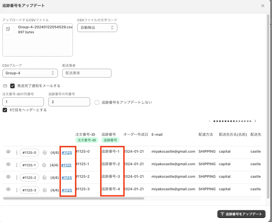 csvファイル (#1125の注文に対して4行の追跡番号を設定する)