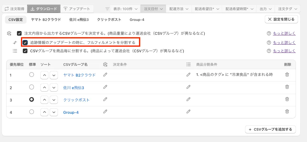 注文内容から出力するCSVグループを決定する をONにする必要があります。