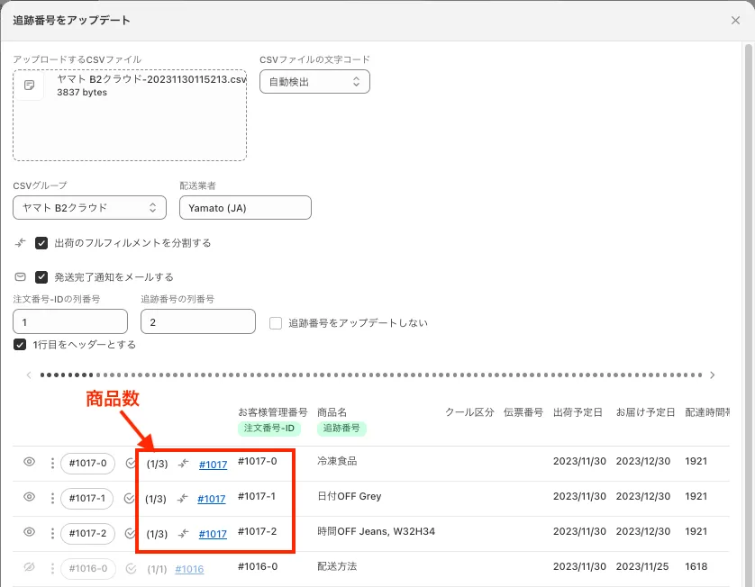 追跡番号をアップデートするときに、CSVを分割することができます。
