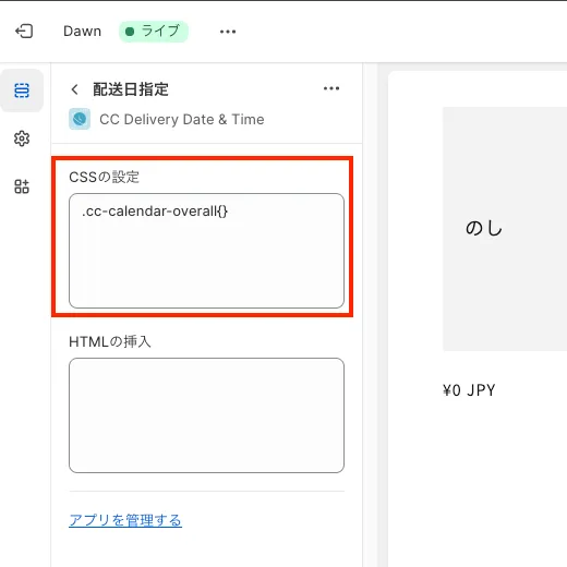 テーマによっては、配送日時指定のウィジェットのレイアウトが崩れることがあります。 アプリのカスタマイズから独自のcssの設定が可能です。