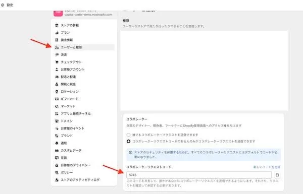 コラボレーションコードは、設定 => ユーザーと権限 => コラボレーターリクエストコード から確認することができます。