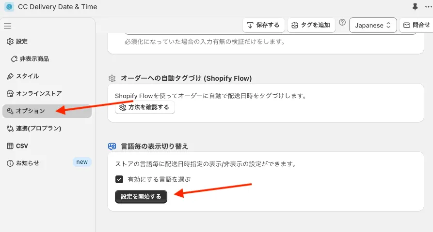 「CC 配送日時指定」の設定画面から オプション => ”言語毎の表示の切り替え” で、どの言語で配送日時指定ウィジェットを表示するかを選ぶことができます。