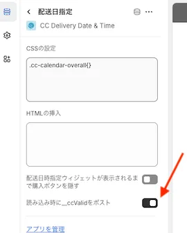 -チェックアウト画面での有効性検証をONにします。 -オンラインストア => テーマ => カスタマイズ から埋込アプリもしくはセクションでアプリの設定画面から “読み込み前に__ccValidをポスト” をONにします。